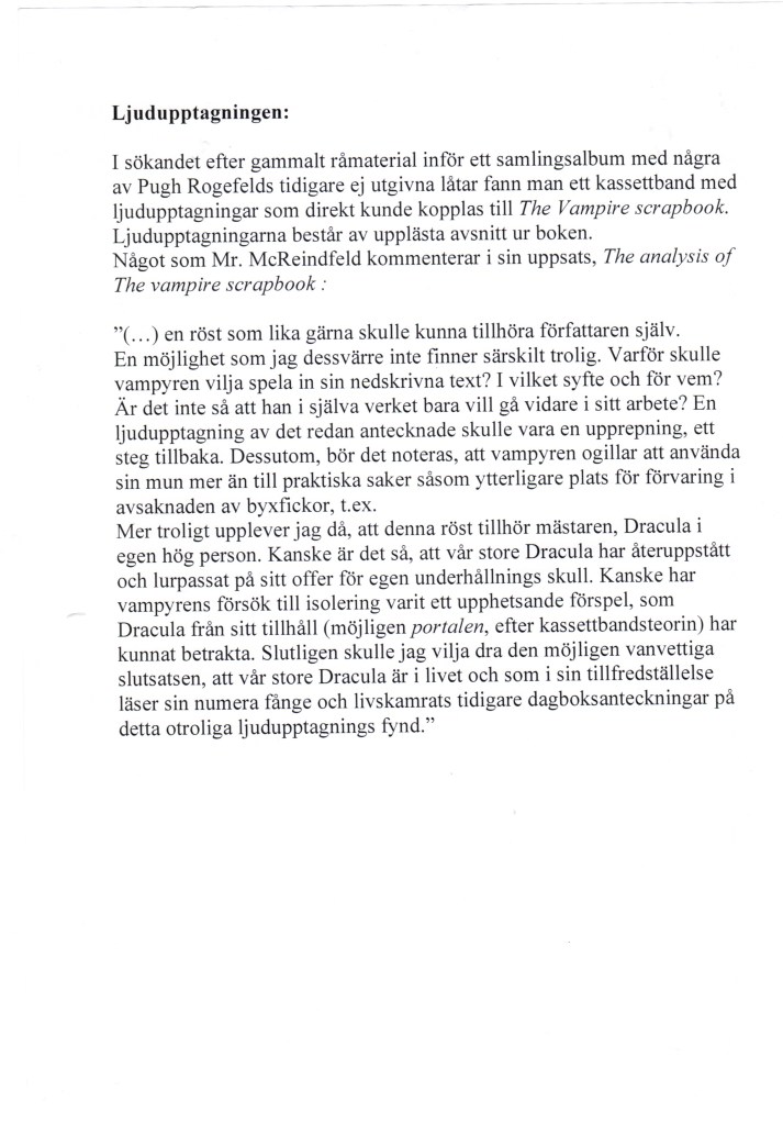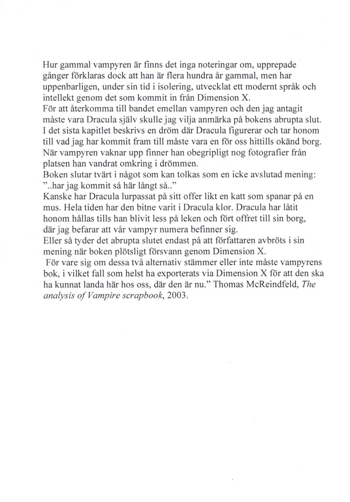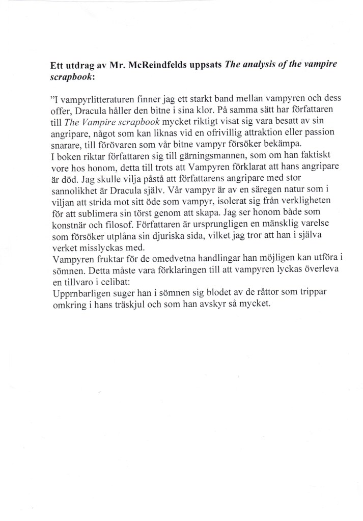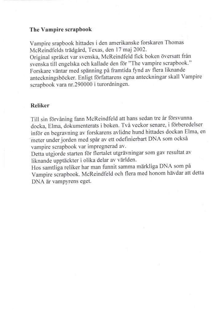 Själva boken som föremål fick inte vidröras, den var en upphittad relik. Forskaren McReinfield påstås ha funnit boken nergrävd i sin trädgård, läs hans analys om vampyrens scrapbook nedan.