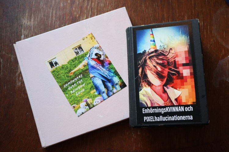 Miljontals böcker slängs och BRÄNNS UPP i Sverige varje år! Akaatti galleri återvinner böcker genom att förvandla de till konstböcker. Det är ett hantverk och resultatet blir ett konstverk som reproduceras av mig, Amanda Katinka Larsson. Just nu går det att beställa Somewhere över the rainbow änna och Enhörningskvinnan och pixelhallucinationerna. Vid beställning sätter jag igång med att klippa och klistra.