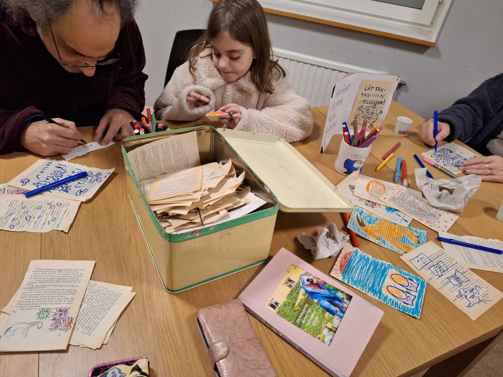 Akaatti erbjuder även bokworkshops. Under våra workshops får besökare plåstra om trasiga böcker, rita i utrivna boksidor, klippa och klistra i böckerna eller skapa något skulptruralt konstverk. Akaatti galleri serverar böcker som bibliotek, butiker, skolor eller privatpersoner lagt i slänghögen. Under workshopen hjälps vi åt att förlänga böckernas liv genom att förvandla dem till konstverk eller laga dem. Är du intresserad av att boka Akaatti galleri för en bokworkshop? Maila: akaattigalleri@gmail.com